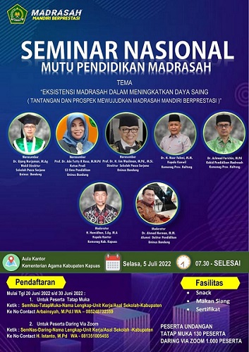 Kuala Kapuas (Humas) Kelompok Kerja Madrasah Tsanawiyah (KKMTs) Propinsi Kalimantan Tengah bakal menggelar Seminar Nasional Pendidikan. Kegiatan akan laksanakan, Selasa, 5 Juli 2022 mendatang di Kuala Kapuas Kalimantan Tengah. Seminar mengambil tema “Eksistensi Madrasah dalam Meningkatkan Daya Saing (Tantangan dan Prospek Mewujudkan Madrasah Mandiri Berprestasi). &n...