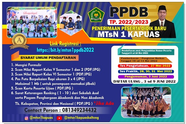 Kuala Kapuas (Humas) MTsN 1 Kapuas melakukan sosialisasi Penerimaan Peserta Didik Baru (PPDB) tahun pembelajaran 2022/2023. Sosialisasi dimulai sejak awal April, dilakukan melalui, spanduk, istagram, website, brosur dan media sosial lainnya. Wakil Kepala Madrasah Bidang Kesiswaan Econ Hasan menuturkan penerimaan peserta didik akan dilaksan...