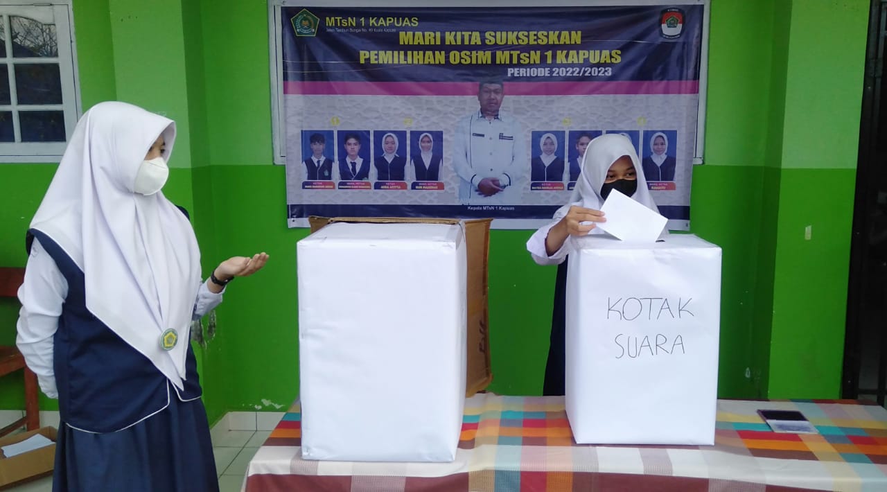 Kuala Kapuas (Humas), Seiring berakhirnya kepengurusan Organisasi Siswa Madrasah (OSIM) masa bakti 2021/2022, maka MTsN 1 Kapuas menggelar pemilihan langsung Ketua dan Wakil Ketua OSIM masa bakti 2022/2023. Pada pemilihan langsung yang digelar (11/4) diikuti empat pasangan calon Ketua dan Wakil Ketua OSIM. &n...